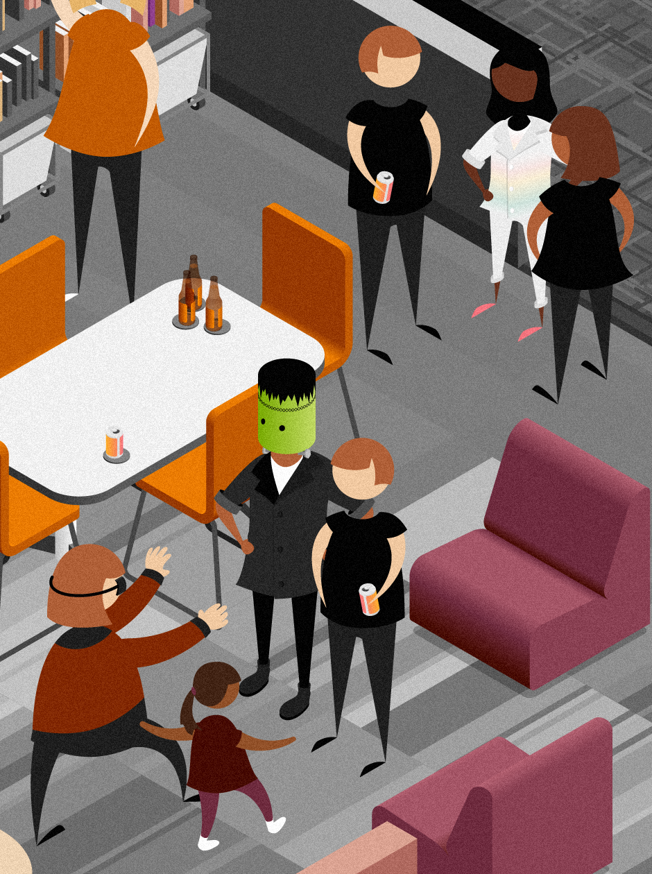 They did the mash; they did the monster mash! In 2021, Utile opened a new multi-purpose space named “the Cloud” upstairs from their main workspace. The combination materials library, makerspace, and event space is home to project workshops and conference calls by day and happy hours, lectures, and parties by night. I illustrated an isometric costume party in The Cloud to celebrate the spookiest night of the year.