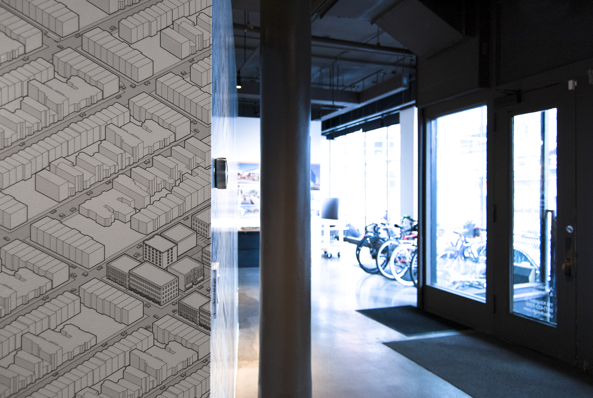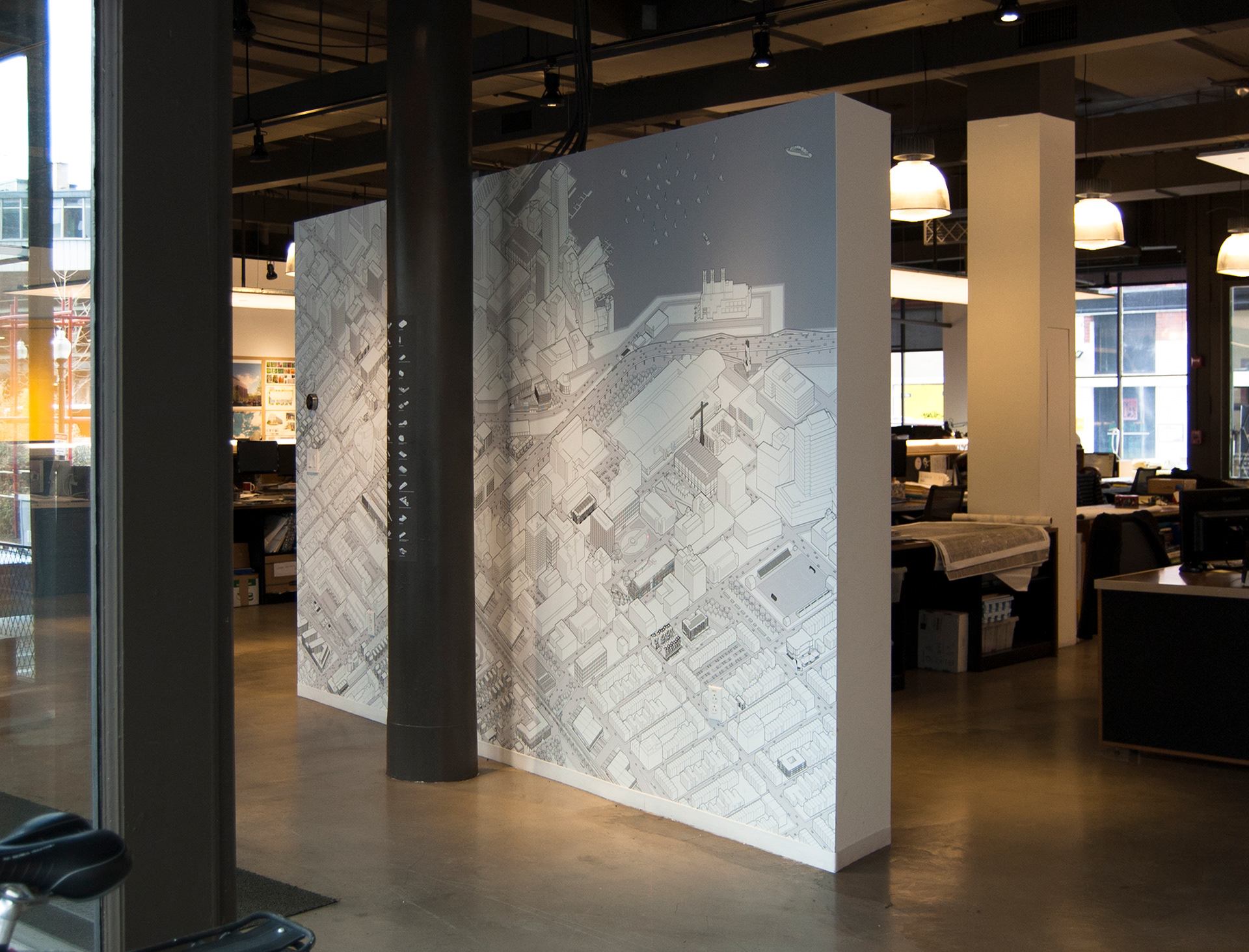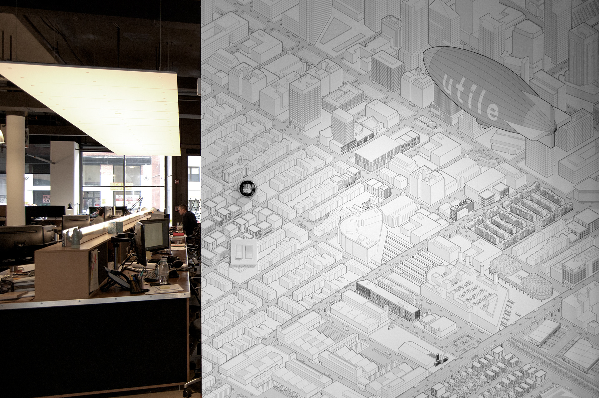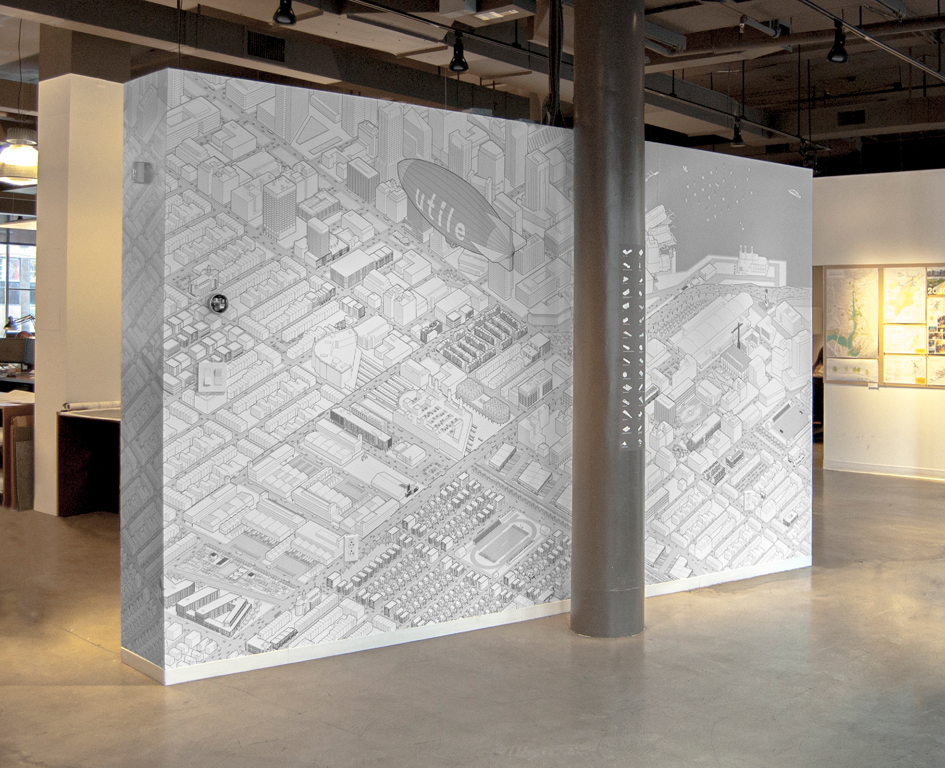Utile, 2014. Utile City is a fictitious city comprising Utile's built work, local landmarks, prototypical building types, and Utile's iconic blimp.